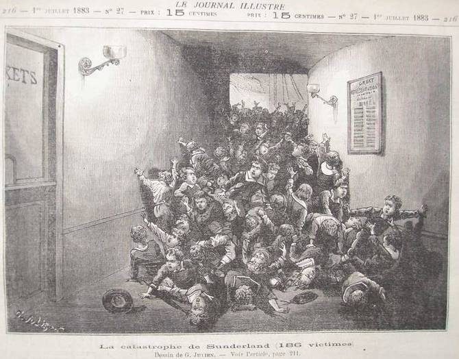 Le 16 juin 1883, dans une salle de concert à Sunderland en Angleterre, se tenait un grand spectacle auquel assistaient environ 1000 enfants. L'événement avait bien commencé, mais les choses ont dérapé lorsqu'on a annoncé aux enfants qu'ils allaient recevoir des cadeaux qui seraient distribués au niveau de la scène. Par peur de ne pas recevoir leur cadeau, les enfants des étages se sont précipités dans les escaliers pour rejoindre le rez-de-chaussée de la salle. Seulement, la porte en bas des escaliers était trop étroite, ce qui a formé un goulot d'étranglement dans lequel les gamins se sont venus s'entasser. Au total, 183 enfants de 3 à 14 ans ont perdu la vie. Tout simplement horrible.