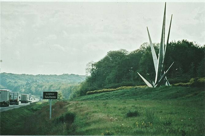Une oeuvre de Éric Sléziak pondue en 1993 qui nous délivre ici un message fort : « Nous vous rappelons que des animaux sauvages peuvent traverser la voie à tout moment, restez vigilants. »