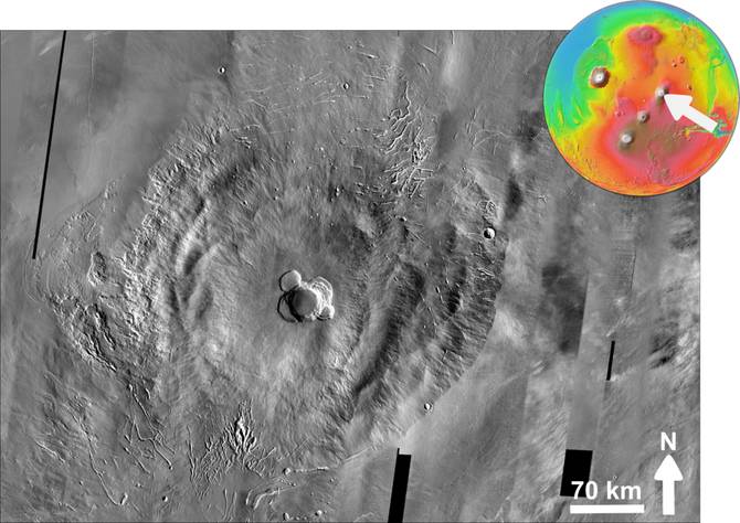 11,7 km. Si Mars fascine à ce point, c'est peut-être aussi à cause de tous ses sommets extrêmement hauts. Arsia Mons est également un volcan bouclier dont la particularité est de posséder une caldeira (pour faire simple, le cratère du volcan) de 110 km de large.