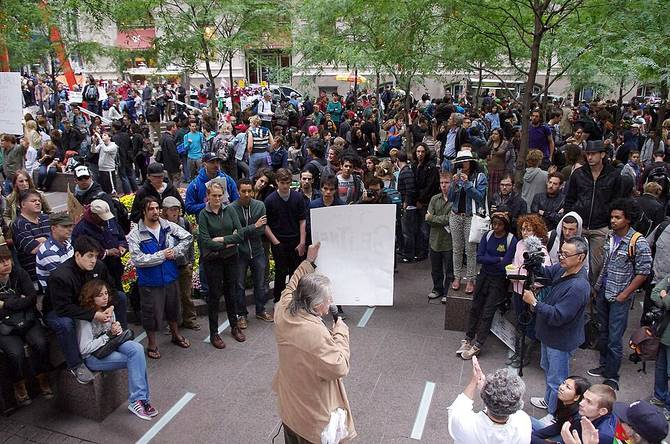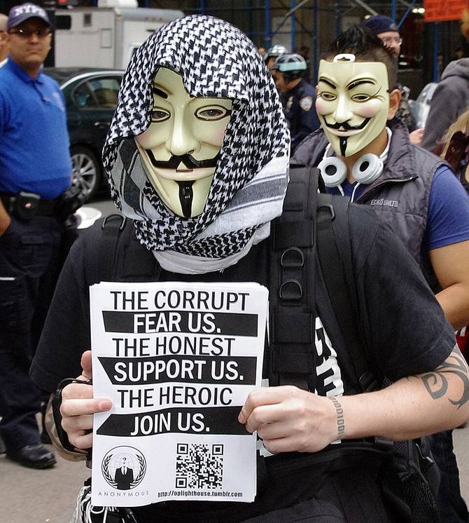 L'occupation pacifique du siège de la bourse américaine en contestation contre le capitalisme avait mené à plusieurs répressions policières contre des gens qui finalement étaient juste assis par terre et ne se montraient pas agressifs. Anonymous avait alors fait fuiter le nom de certains policiers qui avaient utilisé des sprays lacrymogènes et tenté de bloquer le site de Wall Street (le blocage n'a duré que deux minutes).