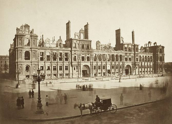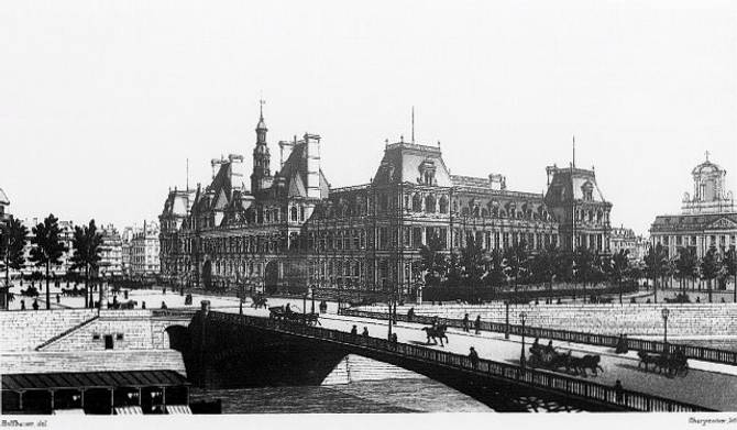 Le premier palais avait été construit entre 1533 et 1628 (oui, fallait pas être pressé) sur des plans de l'architecte italien Boccador. Mais pendant la Commune, en 1871, le palais est incendié par des communards. Tout a été reconstruit entre 1874 et 1882 (on avait progressé niveau rapidité) dans le style de l'ancien bâtiment. Regardez en-dessous, sur la première photo on a le Palais après l'incendie, et la deuxième photo c'est après reconstruction.