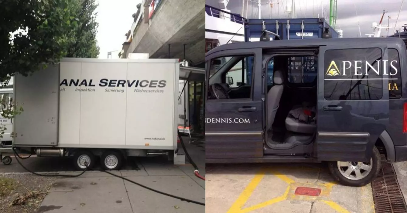 Quand on colle une pub sur une camionnette, on ne pense pas toujours que cette camionnette va vivre, ouvrir ses portes et ses fenêtres et que, conséquemment, l’emplacement des lettres formant un mot sur les parois de la bagnole changera. Et parfois de manière assez peu heureuse. Voire franchement malheureuse.