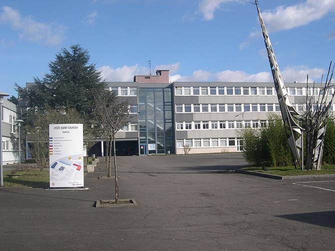 On ne voit ici qu'une petite partie de ce lycée, car l'architecte a eu l'excellente idée de le construire en forme de cercle. Donc vu d'en haut, on dirait une base militaire et vu d'en bas on regrette que ça n'en soit pas une. Parce qu'au moins, les zones militaires sont fermées au public.