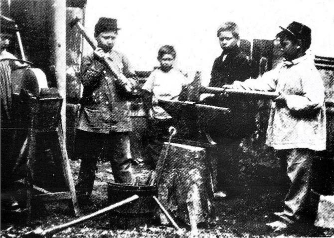 Les enfants dans les usines à la forge, dans les imprimeries et les verreries
