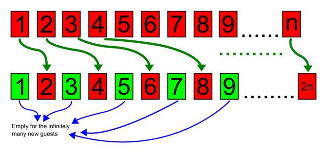 Imaginez un hôtel avec un nombre infini de chambre toutes numérotées. Si un client arrive et que toutes les chambres sont remplies il devra alors avancer dans le couloir un temps infini pour accéder à sa chambre. On propose donc à chaque client de se décaler d'une chambre pour gagner du temps et que le nouveau client prenne la chambre 1.