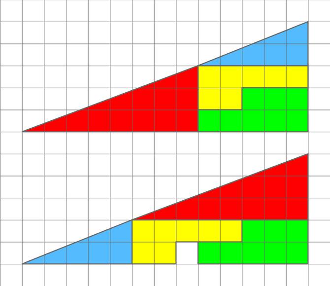 Ce paradoxe géométrique voudrait que si on découpe un triangle en plusieurs parties définies sur un cadrillage et qu'on déplace ces parties pour créer un triangle équivalent on obtienne un triangle dans lequel il manque un carré. En réalité c'est la différence d'hypoténuse entre le carré bleu et le carré rouge qui fout le bordel, celle du premier est concave et l'autre est convexe, le carré manquant est finalement juste là parce qu'il compense cette différence de pente.