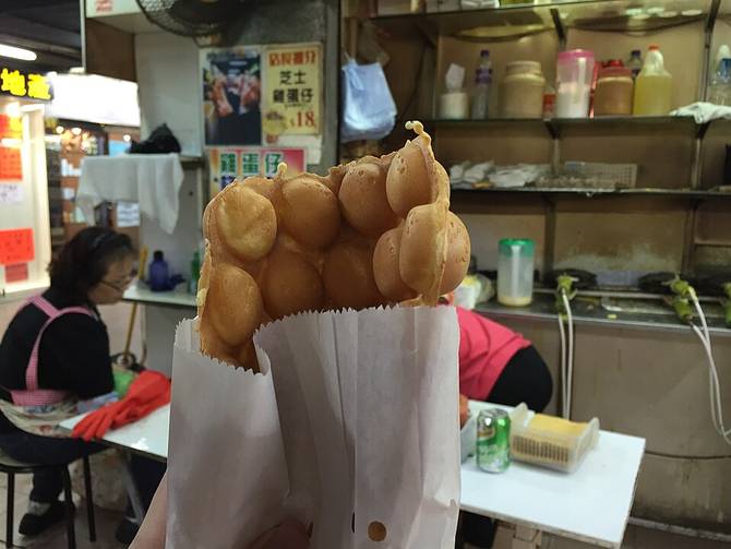 Contrairement à ce que son look pourrait laisser penser, ce ne sont pas des oeufs enfermés dans de la pâte qui donne sa forme à ce plat, mais la technique de cuisson. Habituellement consommée nature, la egg waffle peut être aussi aromatisée au chocolat, au thé vert et au gingembre. Notons également que c'est probablement le snack préféré des gens qui adorent éclater les bulles des emballages plastiques.