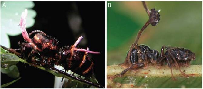 Finissons par une jolie histoire qui vous empêchera peut-être de dormir. Cette histoire parle de l’Ophiocordyceps unilateralis, un champignon vivant dans des milieux tropicaux qui a développé une technique particulièrement affreuse pour se reproduire. Le petit champi attend patiemment sous forme de spores dans la forêt qu'une fourmi viennent le respirer. Un mois plus tard, il s'est assez développé dans le corps de la fourmi pour en prendre le contrôle. En gros, il la dirige un peu comme on dirige une marionnette, mais de l'intérieur. Il la force à monter à une tige de plante puis à s'agripper en hauteur avec ses mandibules. La fourmi meurt là, et la tige du champignon sort de sa tête, se développe, puis disperse de nouveaux pores qui seront respirés par d'autres fourmis. Et ainsi de suite. L'évolution c'est mieux que les films d'horreur en fait.